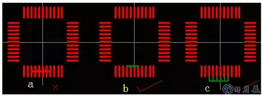 10. 相鄰管腳短接時應注意的問題:下圖a的短接方法不利于工人識別該管腳是否應該相連,且焊接后不美觀。如果畫圖時按圖b、圖c的方法短接并加上阻焊,焊接出來的效果就不一樣:只要保證每個管腳都不相連,該芯片就無短路現(xiàn)象,而且外觀也美觀。