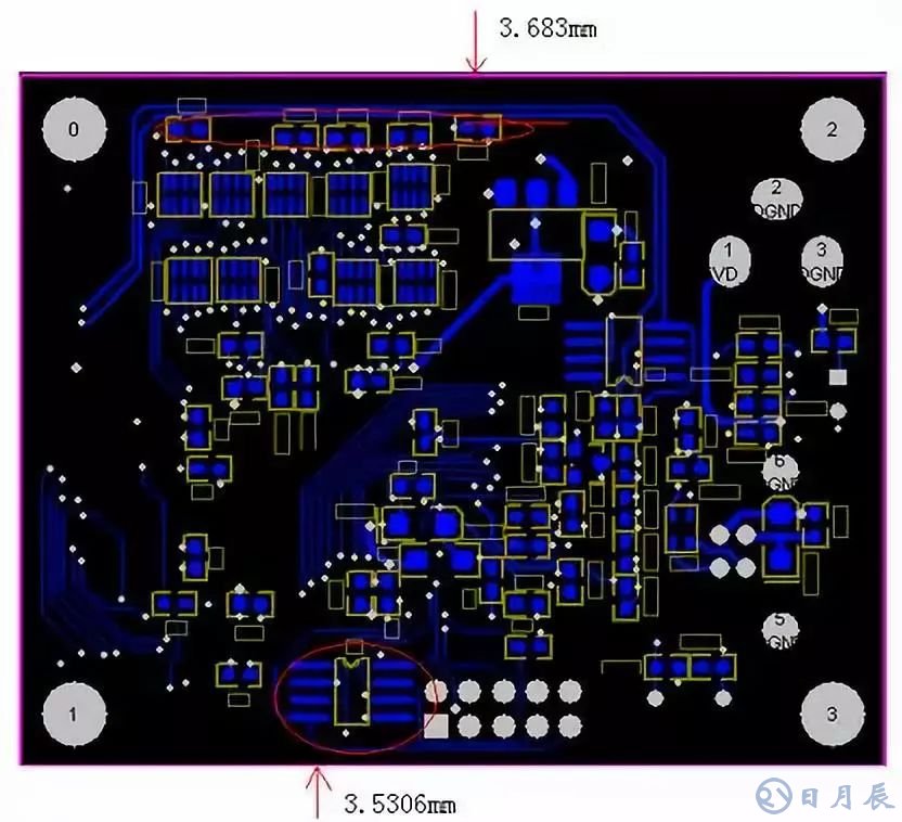 3. 關于留5mm邊:畫PCB時,在長邊方向要留不少于3mm的邊用于貼片機運送電路板,此范圍內貼片機無法貼裝器件。此范圍內不要放置貼片器件。如圖: