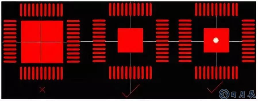 11. 關于芯片底下中間有焊盤的問題:芯片底下中間有焊盤的芯片畫圖時如果按芯片的封裝圖畫中間的焊盤,就容易引起短路現(xiàn)象。建議將中間的焊盤縮小,使它與周圍管腳焊盤之間的距離增大,從而減少短路的機會。如下圖: