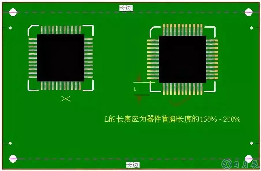 7. 關于IC焊盤應延長:SOP、PLCC、QFP等封裝的IC畫PCB時應延長焊盤,PCB上焊盤長度=IC腳部長度×1.5為適宜,這樣便于手工用烙鐵焊接時,芯片管腳與PCB焊盤、錫三者熔為一體。如圖: