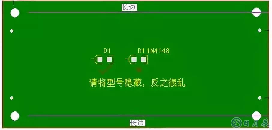 6. 關于絲印和標識:請將器件型號隱藏。尤其是器件密度高的電路板。否則,眼花繚亂影響找到焊接位置。如下圖: