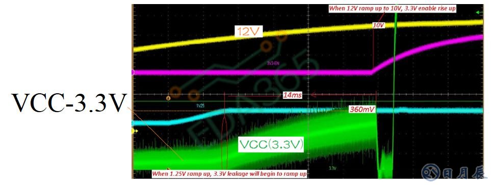 我再來給一張清晰一點圖,VCC每次上電都是先被12V-Fan I/O充電,然后跌落到地,在爬升會3.3V, 原因上面我已經(jīng)給出詳細的解釋,那么又有人問了,這個會有什么問題嗎?我先明確的回答,會出大問題。