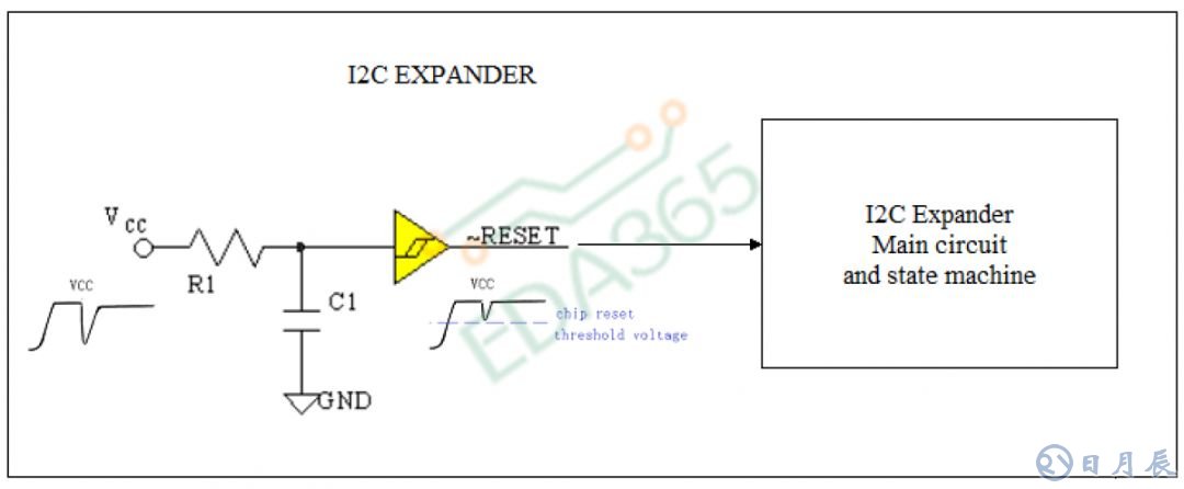 Point和上面的英文意思差不多,就是I2C Expander(我們這里是CPU)被別的電路 通過I/O管腳商店了。我們先來把這顆粒I2C expander的內部電路給畫一下, 我們看到這顆芯片沒有外部復位pin腳,所以一般內部會有一個簡單設計的POR電路: