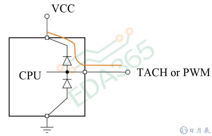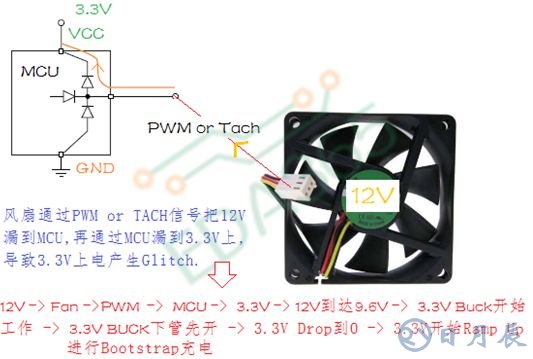 2.由于風扇的12V先上電,PWN/TACH信號線已經(jīng)有電了,于是通過圖中MCU的保護二極管(上管)對3.3V充電;