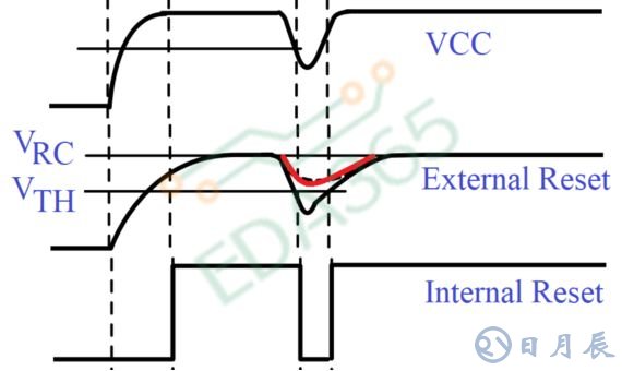 關于上面的現(xiàn)象還有另外一種解釋,就是當VCC的倒鉤時,此時I2C Expander的內部電路已經(jīng)被搞亂了, 但是有內部POR的RC電路的平滑作用, 導致內部Reset被濾平滑了,內部Reset沒有碰到門限電壓,請仔細看上圖紅色的凹陷。