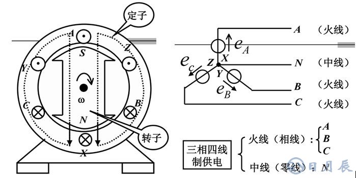 我們先從電的起源發(fā)電廠說起,大家都知道現(xiàn)在家用的電器大部分供電都是單相電220V/50Hz,有三根線火(L)、零(N)、地(PE),一些大功率工業(yè)設(shè)備則有采用三相電,那么從發(fā)電廠出來的電經(jīng)過了那些變換才輸送過來的。下圖是利用轉(zhuǎn)子切割磁感線產(chǎn)生三相電的基本原理,產(chǎn)生的相鄰輸出線之間相位差是120度,采用三相的原因與發(fā)電效率和輸出方式相關(guān),不必深究。