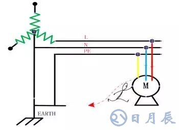 N線又叫工作接零,用來返回回路電流,PE叫做保護(hù)接零,不經(jīng)過變壓器,用來連接設(shè)備金屬外殼到大地。我們可以看一下保護(hù)接地的原理: