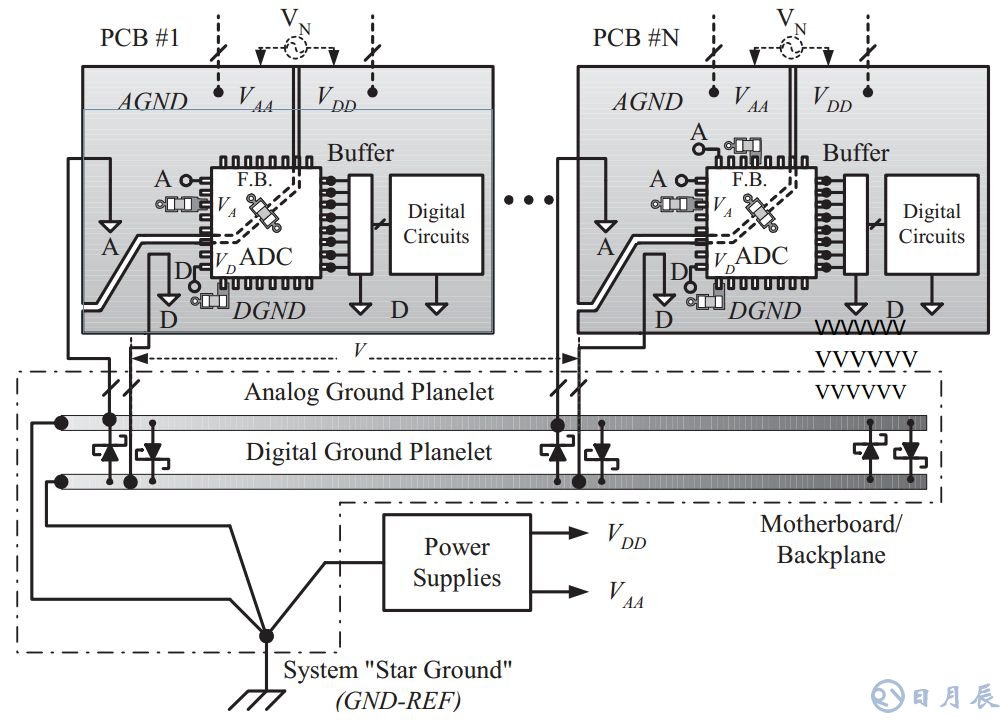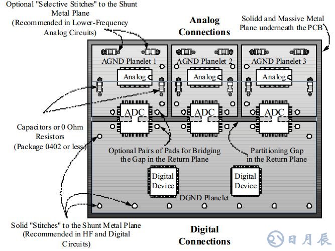 對(duì)于源(功率源、信號(hào)源、干擾源)的回路設(shè)計(jì)是最基本的出發(fā)點(diǎn),但是在實(shí)際中又不能默守陳規(guī)嚴(yán)格按照原則劃分,否則出現(xiàn)問題的可能性還是很大,比如什么時(shí)候模數(shù)的地需要分開,如何評(píng)估互相之間的影響等,分割地之間的聯(lián)系方式等。因此我們需要掌握這些基本原則,對(duì)設(shè)計(jì)有宏觀原則的理解,然后結(jié)合實(shí)際去設(shè)計(jì)真正符合應(yīng)用要求的電路,最后這張圖就是一張非常清晰的關(guān)于地設(shè)計(jì)的結(jié)構(gòu)參考示例。