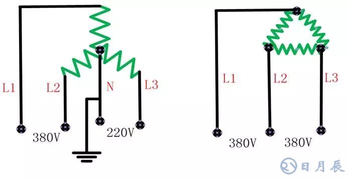 在上圖的三相四線制配電系統(tǒng)中,中性線一般接地,因此也被稱為零線。中性線或者零線的作用就是為了取單相電220V,三相電設(shè)備和單相電設(shè)備供電方式的不同如圖: