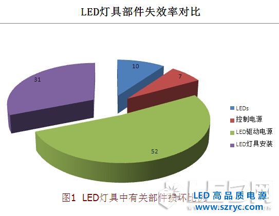 LED燈具中有關(guān)部件損壞比例如圖1所示,其中,LEDs的損壞率為10%,控制電路為7%,LED燈具的安裝為31%,LED驅(qū)動(dòng)器為52%。可見在LED燈具中LEDs的損壞率并不高,LED驅(qū)動(dòng)電路失效率相對(duì)較高為52%,LED燈具失效90%并非來自LED(數(shù)據(jù)來源:Appalachian Lighting Systems)。該數(shù)據(jù)的統(tǒng)計(jì)條件是在5400件LED燈具中失效燈具為29具(失效率為:0.54%)的實(shí)驗(yàn)條件下進(jìn)行的。