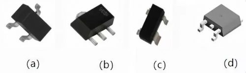 SOT252屬于大功率晶體管,3條引腳從一側(cè)引出,中間一條引腳較短,為集電極,與另一端較大的引腳相連,該引腳為散熱作用的銅片,外形如下圖(d)所示。