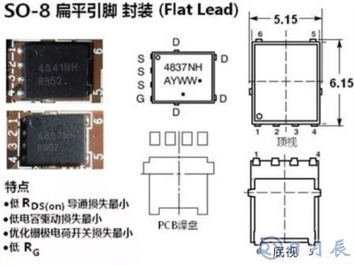 Power 56是Farichild的專用稱呼,正式名稱為DFN 5×6。其封裝面積跟常用的TSOP-8不相上下,而薄型封裝又節(jié)約元件凈空高度,底部Thermal-Pad設(shè)計(jì)降低了熱阻,因此很多功率器件廠商都部署了DFN 5×6。