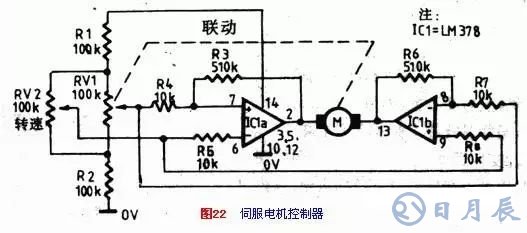 圖22示出了伺服電機的最簡單的應用。電位器RV1由伺服電機帶動。電機可選用電流不超過700mA,電壓為12~24V的任一種伺服電機。圖中RV1 和RV2是接成惠斯登(Wheatstone)電橋。集成電路LM378是雙路4瓦功率放大器,也以橋接方式構(gòu)成電機驅(qū)動差分放大器。