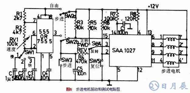 這個電路用于混和型四相步進電機,額定電流可達300mA。電機可用SW3進行手工的單步試驗,或者用SW2經(jīng)555/7555無穩(wěn)振蕩器進行自動步進的試驗。SW4可控制電機的方向。SW5用于復位控制試驗。