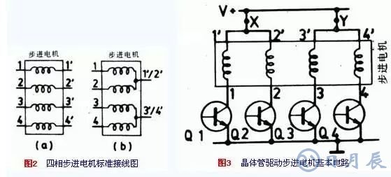 在實際應用中,最流行的還是混和型的步進電機。但工作原理與圖1所示的可變磁阻型同步電機相同。但結(jié)構(gòu)上稍有不同。例如它的轉(zhuǎn)子嵌有永磁鐵。激勵磁通平行于X軸。一般來說,這類電機具有四相繞組,有八個獨立的引線終端,如圖2a所示?;蛘呓映蓛蓚€三端形式,如圖2b所示。每相用雙極性晶體管驅(qū)動,并且連接的極性要正確。