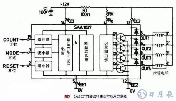 四相步進電機可用幾種專用的集成電路驅(qū)動器,SAAl027是其中常用的一種,它的特點是工作電壓范圍寬9.5V~18V;輸出驅(qū)動電流大,可達500mA。它適合作四相全步步進電機的控制。圖4是SAAl027的外形和引腳功能圖。圖5(下面↓)是它的內(nèi)部原理方塊圖及基本應用。