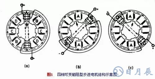 圖1是一種四相可變磁阻型的步進電機結(jié)構(gòu)示意圖。這種電機定子上有八個凸齒,每一個齒上有一個線圈。線圈繞組的連接方式,是對稱齒上的兩個線圈進行反相連接,如圖中所示。八個齒構(gòu)成四對,所以稱為四相步進電機。