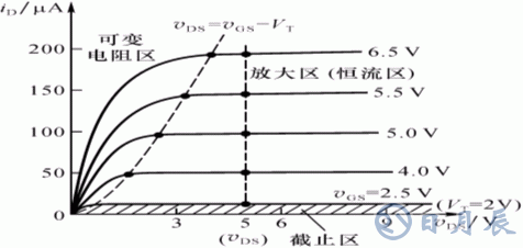 與三極管的特性相似,也可分為3個區(qū):可變電阻區(qū),放大區(qū)(恒流區(qū)、飽和區(qū)), 截止區(qū)(夾斷區(qū))??勺冸娮鑵^(qū)管子導通,但溝道尚未預夾斷,即滿足的條件為: