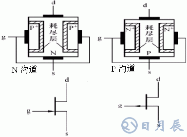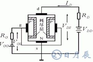 在N區(qū)兩側擴散兩個P+區(qū),形成兩個PN結。兩個P+區(qū)相連,引出柵極g。N體的上下兩端分別引出漏極d和源極s。
