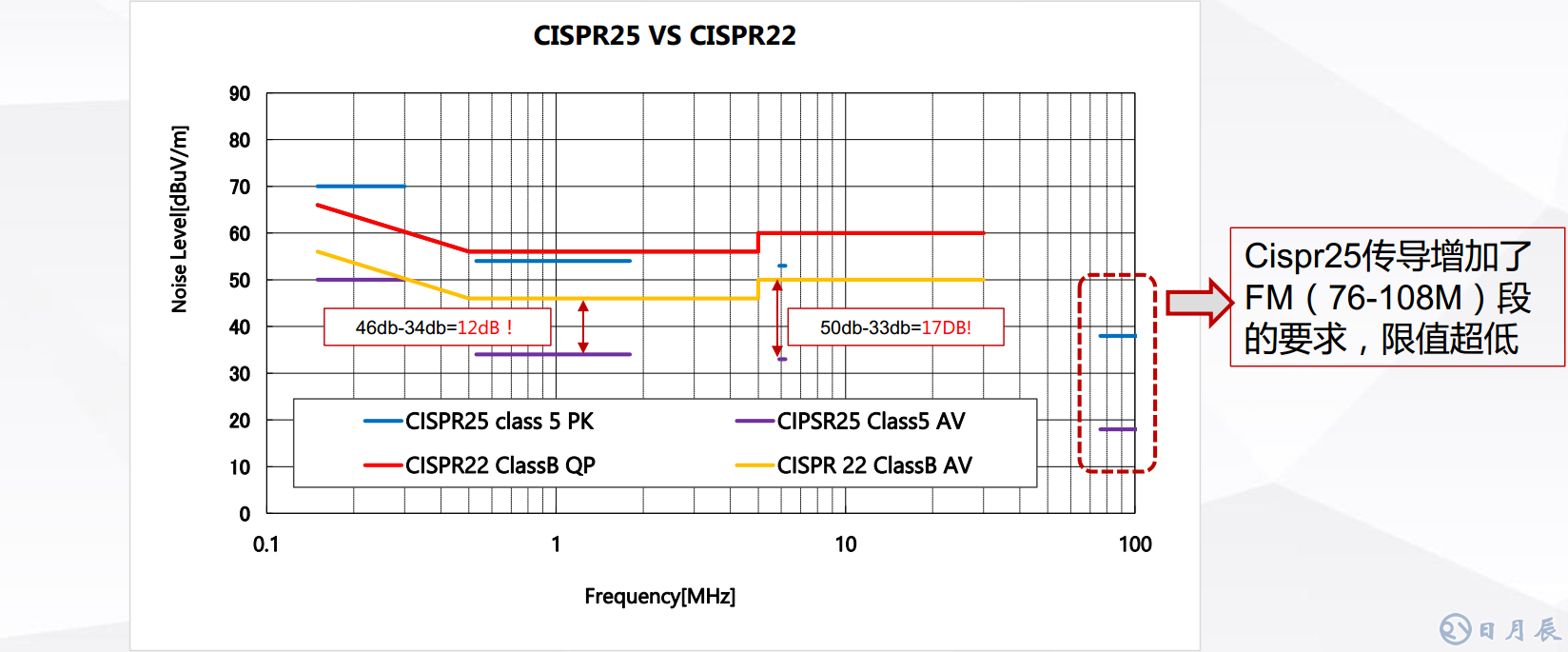 歷史上普遍接受的國際電磁干擾標(biāo)準(zhǔn)是CISPR-22,美國的電磁干擾標(biāo)準(zhǔn)是FCC,CISPR-22與FCC有所不同,但一般來說如果電源符合CISPR-22標(biāo)準(zhǔn),那么它也符合FCC標(biāo)準(zhǔn)??傊瓹ISPR-22標(biāo)準(zhǔn)已經(jīng)成為全世界都遵守的基本標(biāo)準(zhǔn)。汽車上的電磁干擾標(biāo)準(zhǔn)是CISPR-25,相對CISPR22來說CISPR-25標(biāo)準(zhǔn)限制值更低并且額外對FM頻段做了很嚴(yán)的限制要求。具體傳導(dǎo)測試限制要求如圖2所示。