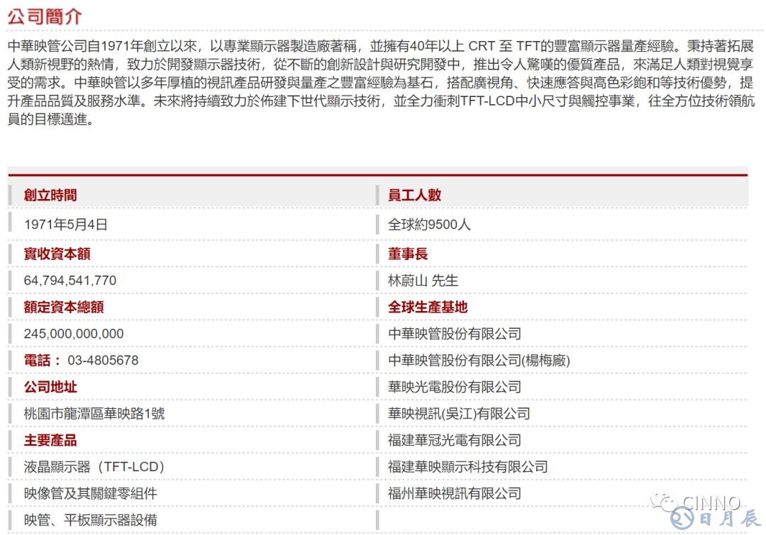 中華映管股份有限公司(Chunghwa Picture Tubes, Ltd.),成立于1971年5月4日,為世界最重要的顯示器制造廠和面板五虎之一。成立初期由大同公司林挺生擔(dān)任董事長,亦是大同公司最重要的轉(zhuǎn)投資事業(yè)。該公司是臺灣早期研發(fā)視訊產(chǎn)品關(guān)鍵零組件映像管的重要廠商,早期在映像管時(shí)代,其顯示器產(chǎn)量為全球前三大,并因此將臺灣推向“顯示器王國”的世界舞臺。