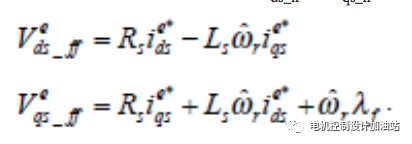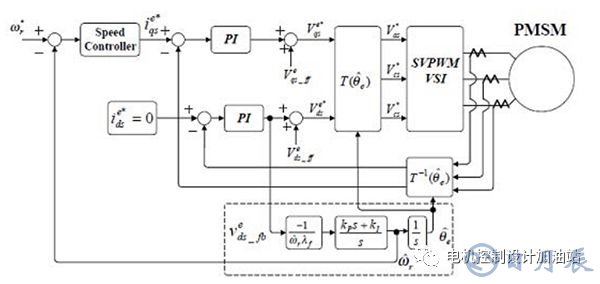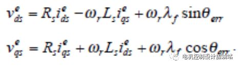 圖1為無(wú)傳感器矢量控制方案的框圖,其中不含位置傳感器。框圖中,軸間控制的正饋?lái)?xiàng)Vds_和Vqs_可以表示為: