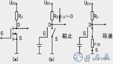 uGS>開啟電壓UT:MOS管工作在導(dǎo)通區(qū),漏源電流iDS=UDD/(RD rDS)。其中,rDS為MOS管導(dǎo)通時(shí)的漏源電阻。輸出電壓UDS=UDD·rDS/(RD rDS),如果rDS《RD,則uDS≈0V,MOS管處于“接通”狀態(tài),其等效電路如上圖(c)所示。