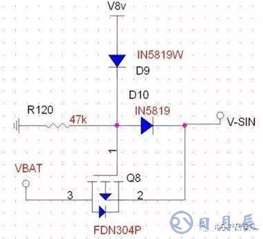 由PMOS來進(jìn)行電壓的選擇,當(dāng)V8V存在時(shí),此時(shí)電壓全部由V8V提供,將PMOS關(guān)閉,VBAT不提供電壓給VSIN,而當(dāng)V8V為低時(shí),VSIN由8V供電。注意R120的接地,該電阻能將柵極電壓穩(wěn)定地拉低,確保PMOS的正常開啟,這也是前文所描述的柵極高阻抗所帶來的狀態(tài)隱患。D9和D10的作用在于防止電壓的倒灌。D9可以省略。這里要注意到實(shí)際上該電路的DS接反,這樣由附生二極管導(dǎo)通導(dǎo)致了開關(guān)管的功能不能達(dá)到,實(shí)際應(yīng)用要注意。