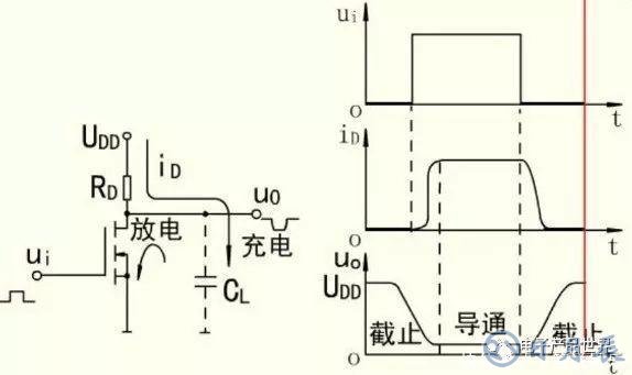 MOS管在導(dǎo)通與截止兩種狀態(tài)發(fā)生轉(zhuǎn)換時(shí)同樣存在過渡過程,但其動(dòng)態(tài)特性主要取決于與電路有關(guān)的雜散電容充、放電所需的時(shí)間,而管子本身導(dǎo)通和截止時(shí)電荷積累和消散的時(shí)間是很小的。下圖分別給出了一個(gè)NMOS管組成的電路及其動(dòng)態(tài)特性示意圖。