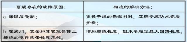 電伴熱系統(tǒng)在正確的安裝和操作時,其運行是安全可靠的,使用壽命也較長。但由于安裝運行維護不當(dāng),或運行過程中的工藝設(shè)備、管線運行狀態(tài)或溫度等條件的變化,會引起不必要的故障,減少使用壽命。這就要求操作人員要及時發(fā)現(xiàn)故障并查明原因,迅速解決,保證電伴熱系統(tǒng)安全可靠地運行。