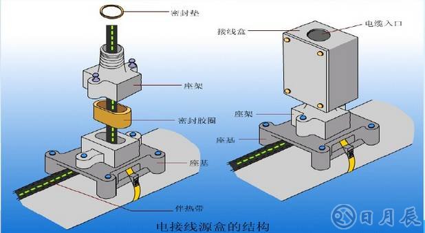 電源電纜敷設(shè)到電伴熱現(xiàn)場后,通過電源接線盒與電伴熱帶連接。電源接線盒適用于危險區(qū)域。安裝時,注意接線盒頂部電纜入口處的密封,以避免雨水進入。接線盒及座基的結(jié)構(gòu)如圖所示。