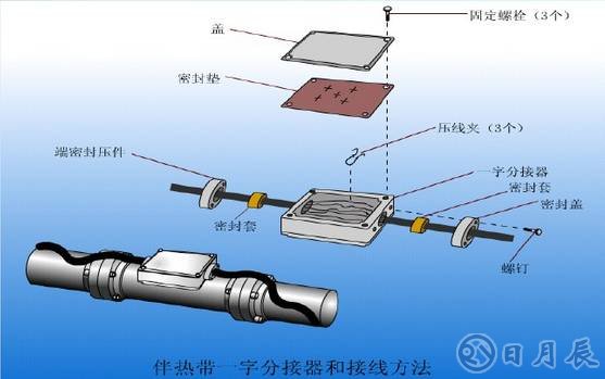 電伴熱帶的中間分線盒有“-”字型和“T”字形兩種分線盒的作用一是在管道分支時,電伴熱帶也隨著分出支路,二是電伴熱帶出故障時,方便故障點的查找和確定,便于更換某一段電伴熱帶。中間分線盒的結(jié)構(gòu)和接線方法如圖所示。
