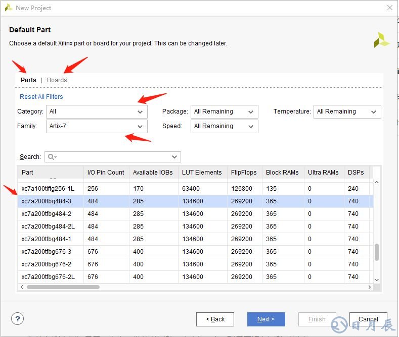 5. 選擇器件或者板卡。Parts表示器件,當然如果是板卡就點擊Boards。器件可以根據(jù)系列去選,也可以直接在Search欄搜索器件型號。器件的選擇根據(jù)你的FPGA芯片來定,一般在你所用的開發(fā)板手冊里面可以找到。選擇完畢點擊Next。