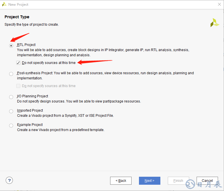 4. 選擇RTL Project ,此時把Do not specify at this time勾上,表示在新建工程時不去指定源文件。