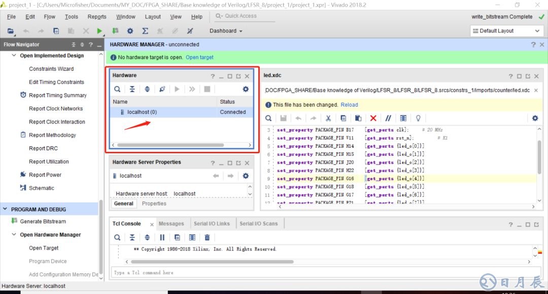Bitstream文件生成完畢之后,出現(xiàn)如下彈框。接下來選擇Open Hardware Manager,點擊OK。準備上班測試。