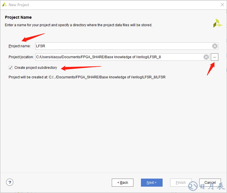 4. 指定文件名與路徑(默認存放在工程默認路徑),文件類型(File type)選擇為Verilog,如果你用的是其它硬件描述語言,則選擇你用的語言類型。