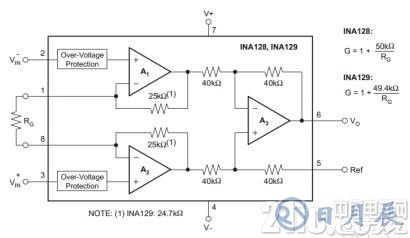 下圖是INA128內(nèi)部結(jié)構(gòu):此圖來自INA128數(shù)據(jù)手冊(cè);電阻式應(yīng)變片電橋壓力傳感器的說明與應(yīng)用解析介紹INA128內(nèi)部電路