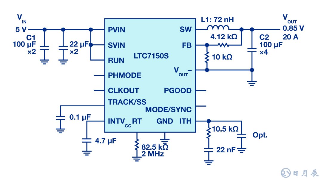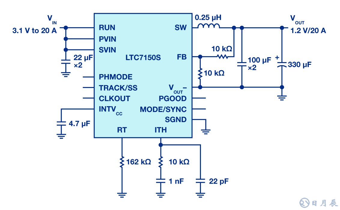 <span]圖1顯示了采用1MHz時LTC7150S開關的SoC和CPU功耗的20A解決方案的1.2V輸出。該電路可輕松修改,以適應其他輸出組合,包括3.3V,1.8V,1.1V和0.6V,以利用LTC7150S的寬輸入范圍。LTC7150S具有輸出電流能力,可用作第一級5V電源,隨后可在各種輸出端連接多個下游第二級開關或LDO穩(wěn)壓器。