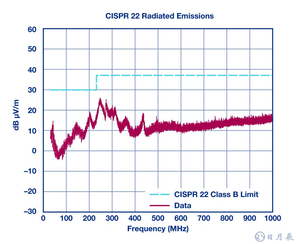 <figure]ADI公司專有的Silent Switcher 2架構通過集成熱回路電容自動抵消EMI,最大限度地減少了噪聲天線尺寸。與集成MOSFET相結合,即使在非??斓拈_關邊沿,也可顯著降低熱環(huán)中存儲的開關節(jié)點振鈴和相關能量。結果是出色的EMI性能,同時最大限度地降低了AC開關損耗。LTC7150S中集成了Silent Switcher 2,可最大限度地降低EMI并提供高效率,極大地簡化了EMI濾波器的設計和布局,是噪聲敏感環(huán)境的理想選擇。LTC7150S通過CISPR22 / 32傳導和輻射EMI峰值限制,前面只有一個簡單的EMI濾波器。圖3顯示了輻射EMI CISPR 22測試結果。