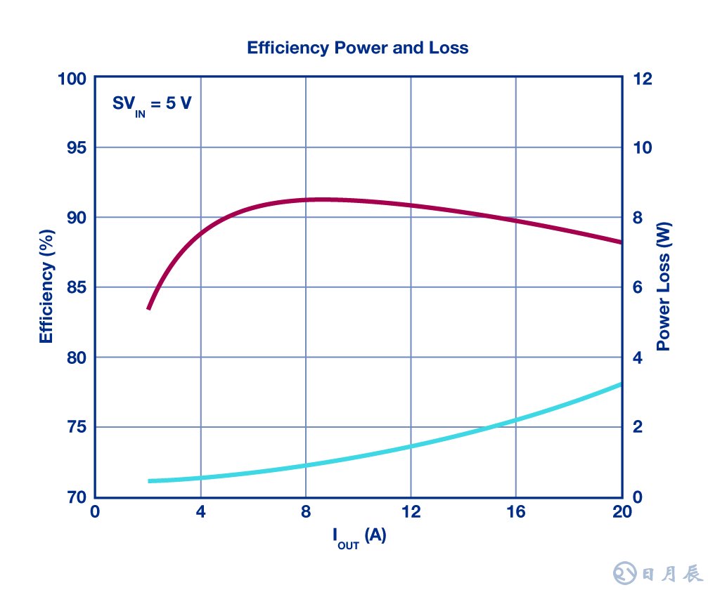 圖1.降壓轉換器的原理圖和效率:20 A時12 V IN至1.2 V OUT