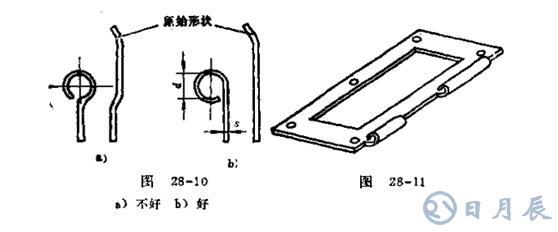 滾卷邊是一種特殊的彎形。卷孔內(nèi)徑大小隨卷邊工件的材料厚薄而定,厚的其內(nèi)徑應取大寫,一般取內(nèi)徑d≥1.5t板厚即可。卷邊的中心線設在金屬片中心上是不必要的。若將金屬片平面設在其圓柱體相切位置處,則制造較為經(jīng)濟,如下圖b所示。