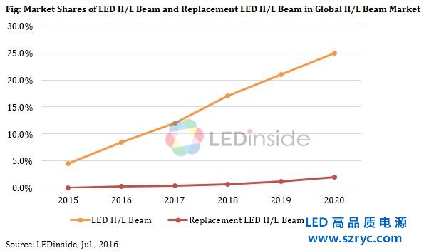 呂理舜表示,隨著價(jià)格下滑與光效提昇,LED頭燈滲透率也將逐漸提昇,產(chǎn)品定位也將從高階逐漸滲透至中階車種。此外,替換式LED頭燈的出現(xiàn),將緩慢改變過去LED頭燈模組化的整體性,切割出更平價(jià)的LED頭燈產(chǎn)品。