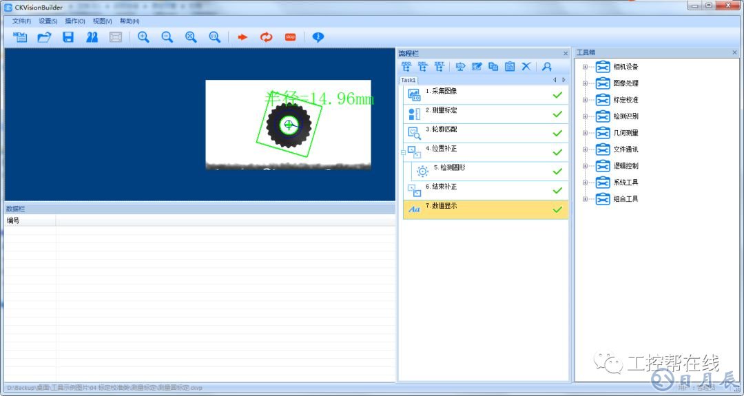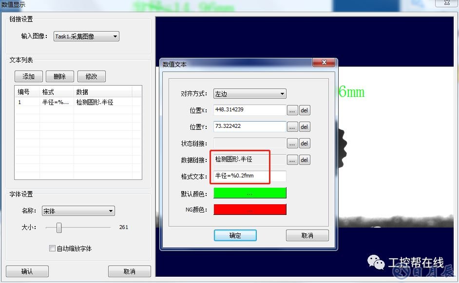 6. 數(shù)值顯示。添加“數(shù)值顯示”工具至流程欄,數(shù)據(jù)鏈接為檢測圓形的半徑,格式文本設(shè)為“半徑=%0.2f mm”如下圖6所示。