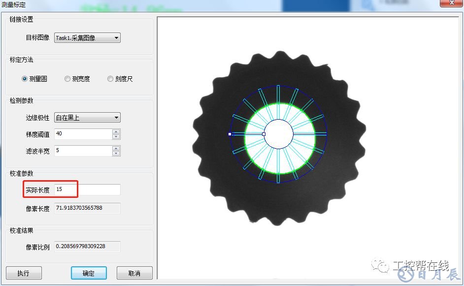 2. 測量標(biāo)定。添加“測量標(biāo)定”工具至流程欄,標(biāo)定方法設(shè)置為標(biāo)定圓,邊緣極性設(shè)置為白在黑上,梯度閾值為40,濾波半寬為5。實際長度輸入圓的實際半徑長度為15。如下圖2所示。