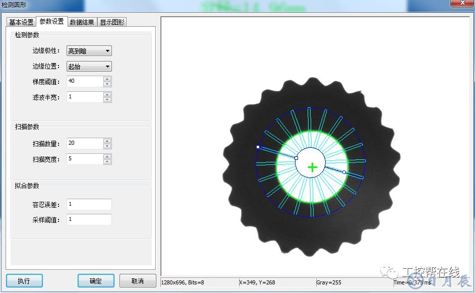 5. 檢測圓形。添加“檢測圓形”工具至位置補正與結(jié)束補正之間,邊緣極性設(shè)為“亮到暗”,邊緣位置起始,梯度閾值為40,濾波半寬1,如下圖5所示。