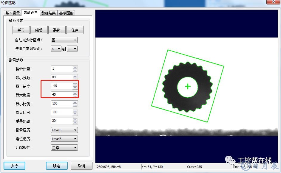 3. 輪廓匹配。添加“輪廓匹配”工具至流程欄,學(xué)習(xí)模板,設(shè)置旋轉(zhuǎn)最小角度和最大角度。如下圖3所示。