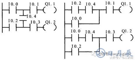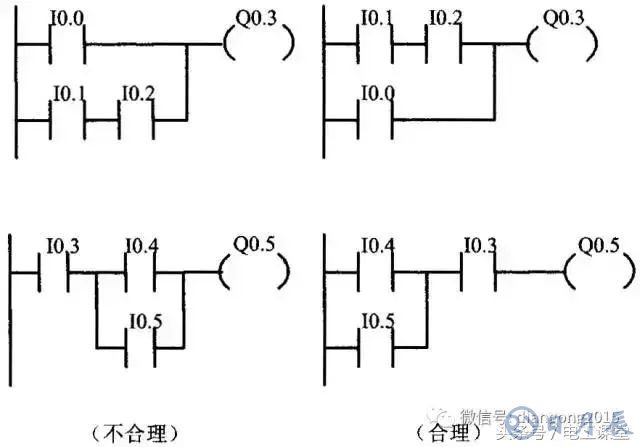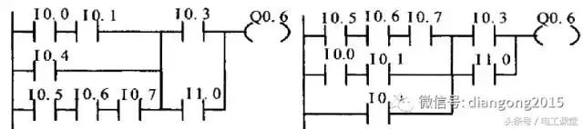 (3)幾個(gè)串聯(lián)支路相并聯(lián),應(yīng)將觸點(diǎn)多的支路安排在上面;幾個(gè)并聯(lián)回路的串聯(lián),應(yīng)將并聯(lián)支路數(shù)多的安排在左面。按此規(guī)則編制的梯形圖可減少用戶程序步數(shù),縮短程序掃描時(shí)間。