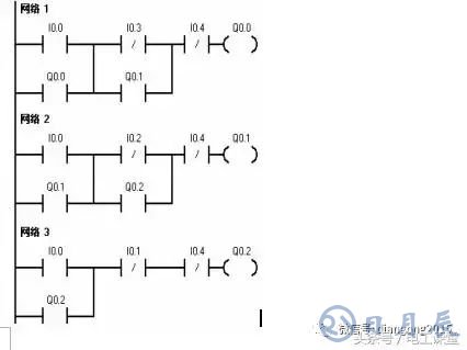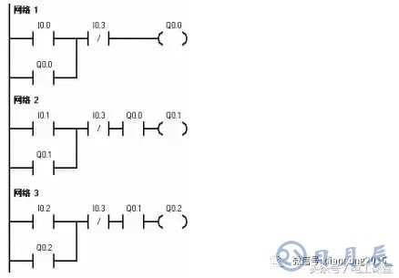 2. 單向順序停止控制電路就是要求按一定順序停止已經(jīng)執(zhí)行的各機(jī)構(gòu)。只有Q0.2被停止后才可以停止Q0.1,若想停止Q0.0,則必須先停止Q0.1。I0.4為急停按鈕。