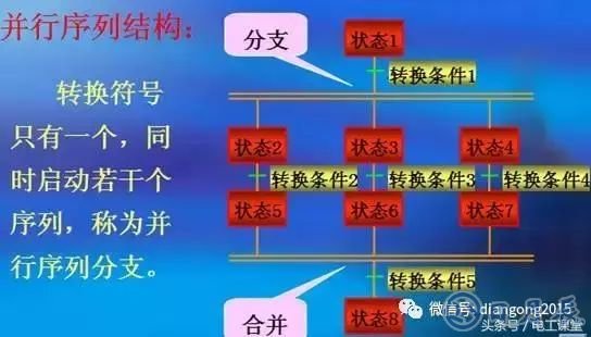 并行序列的結(jié)束稱為合并。轉(zhuǎn)換符號在水平線以下,當(dāng)雙水平線之上的所有前級都處于活動(dòng)狀態(tài)時(shí),且轉(zhuǎn)換條件成立,則下一步被激活。同時(shí)所有前級步都變?yōu)椴换顒?dòng)步。