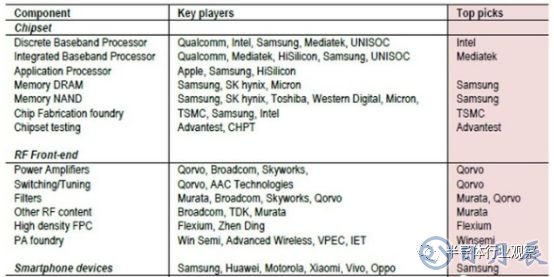 5G將極大推動移動互聯(lián)網(wǎng)發(fā)展并促進開發(fā)如4K視頻和VR/AR等新功能。因此,關(guān)鍵的半導(dǎo)體供應(yīng)鏈部件將獲得額外的收入,比如分立基帶(Discrete B), 應(yīng)用處理器 (AP), 射頻前端 (RF Front-end),天線(Antenna)和功放(PA)將會受益。伴隨高速網(wǎng)絡(luò)下載大容量文件的需要,5G的閃存用量將比4G增長43%。至2022年5G不斷成熟,類似應(yīng)用處理器)/基帶/存儲器等半成品增長空間將逐漸消失,但由于物聯(lián)網(wǎng)接入終端的普及,射頻將仍有增長潛力。表1是摩根大通整理的主要受益的半導(dǎo)體公司清單: